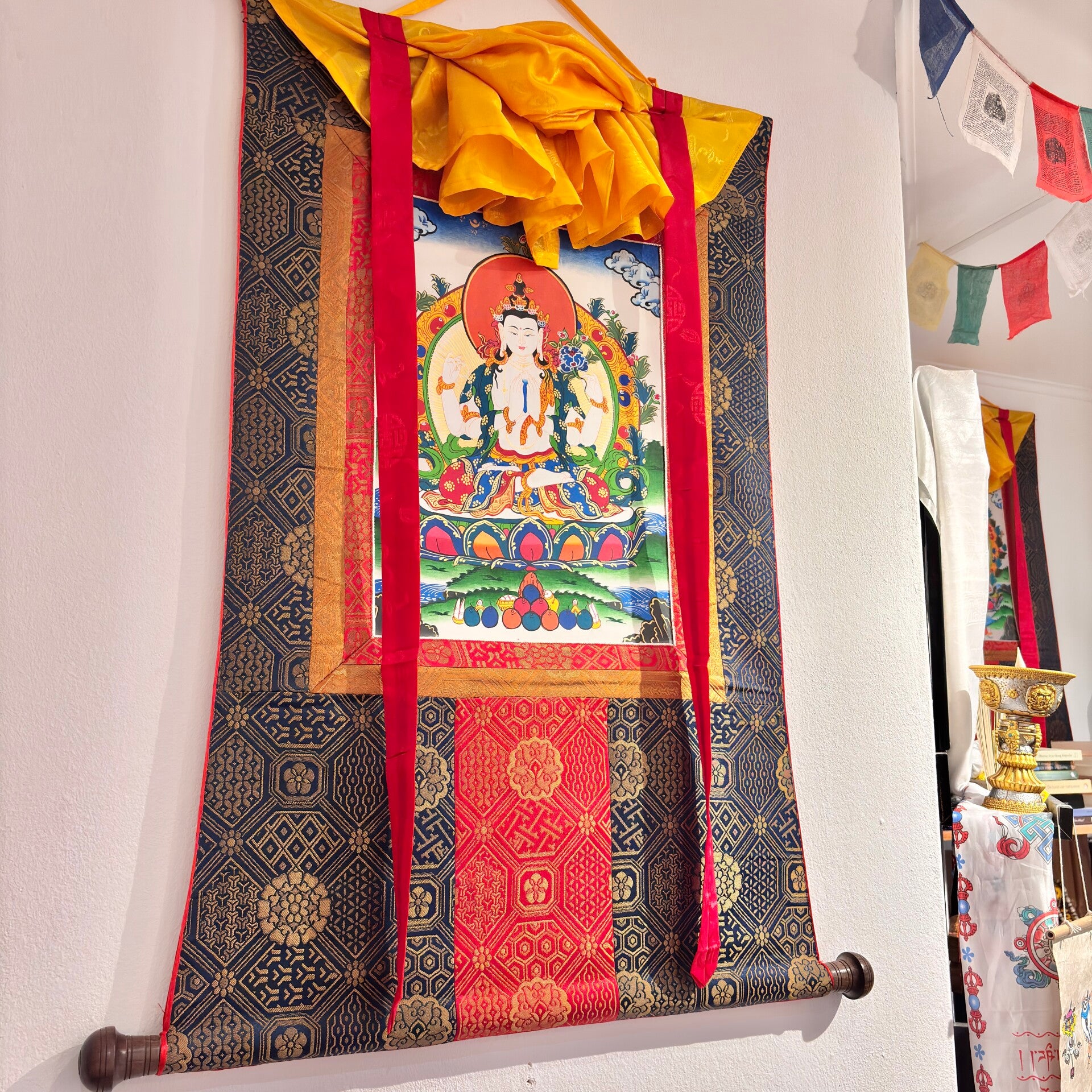 Een Tibetaanse thangka is een traditioneel, handgeschilderd boeddhistisch schilderij op katoen of zijde, vaak omlijst met rijk brokaat. Deze heilige kunstvorm wordt al eeuwenlang gebruikt binnen het Tibetaans boeddhisme als meditatie- en visualisatieobject.