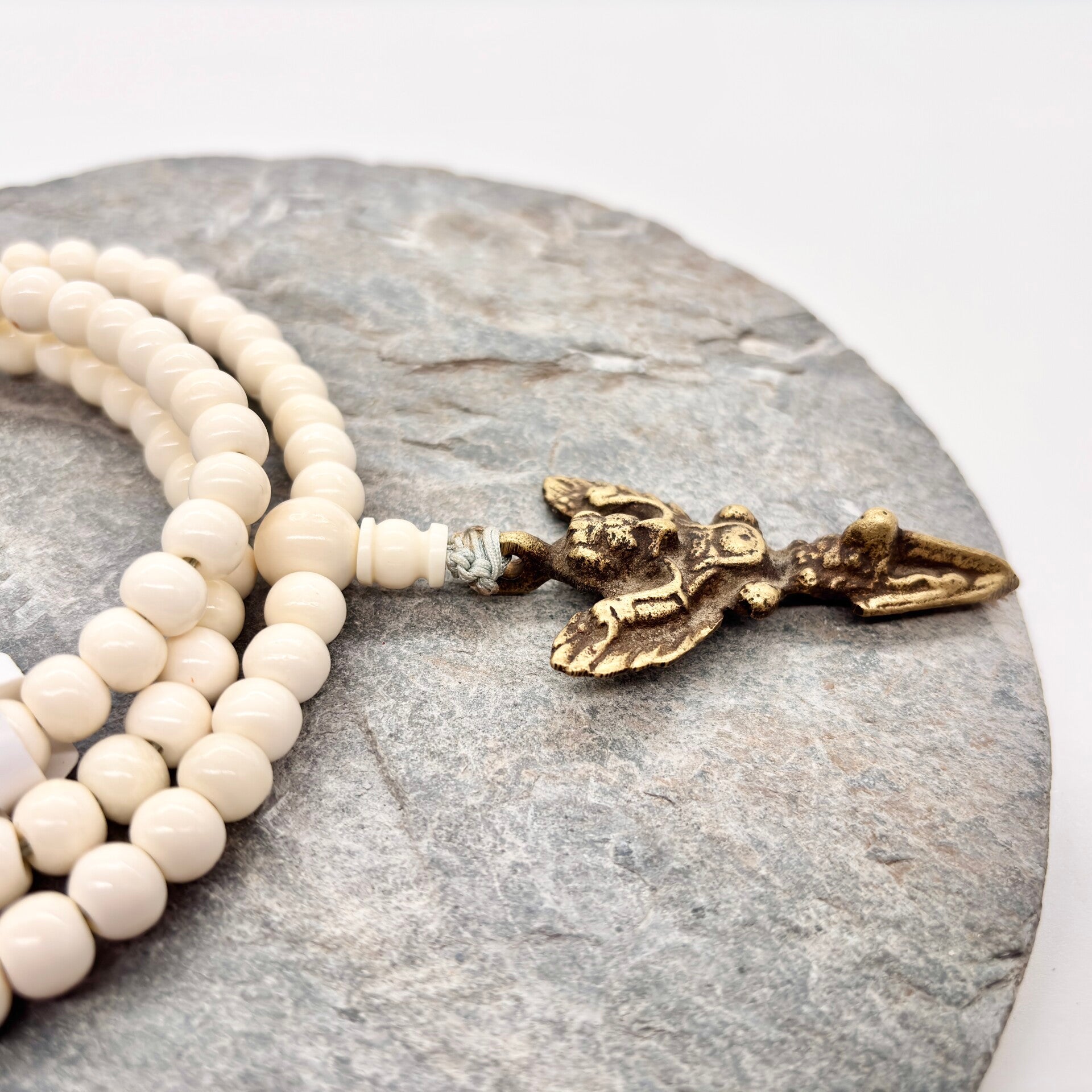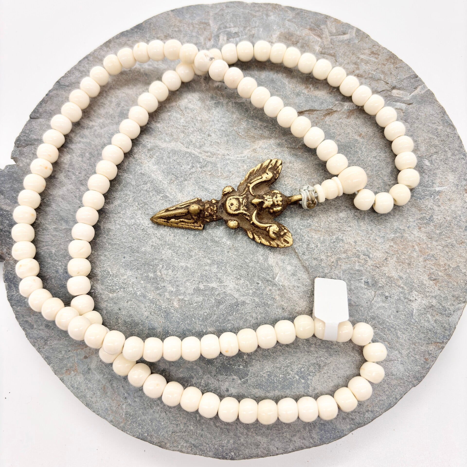 Deze handgemaakte mala is vervaardigd uit gladde, crèmekleurige yakbeen kralen, die in de Tibetaanse traditie symbool staan voor vergankelijkheid en compassie. De natuurlijke uitstraling geeft de mala een pure en authentieke energie.