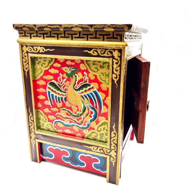Deze Tibetaanse houten kist is een traditioneel handgemaakt stuk uit de Himalaya, met de hand beschilderd volgens eeuwenoude technieken. Elke kist heeft zijn eigen karakter, met natuurlijk hout, gelaagde kleuren en decoratieve details die de Tibetaanse kunst en cultuur weerspiegelen.