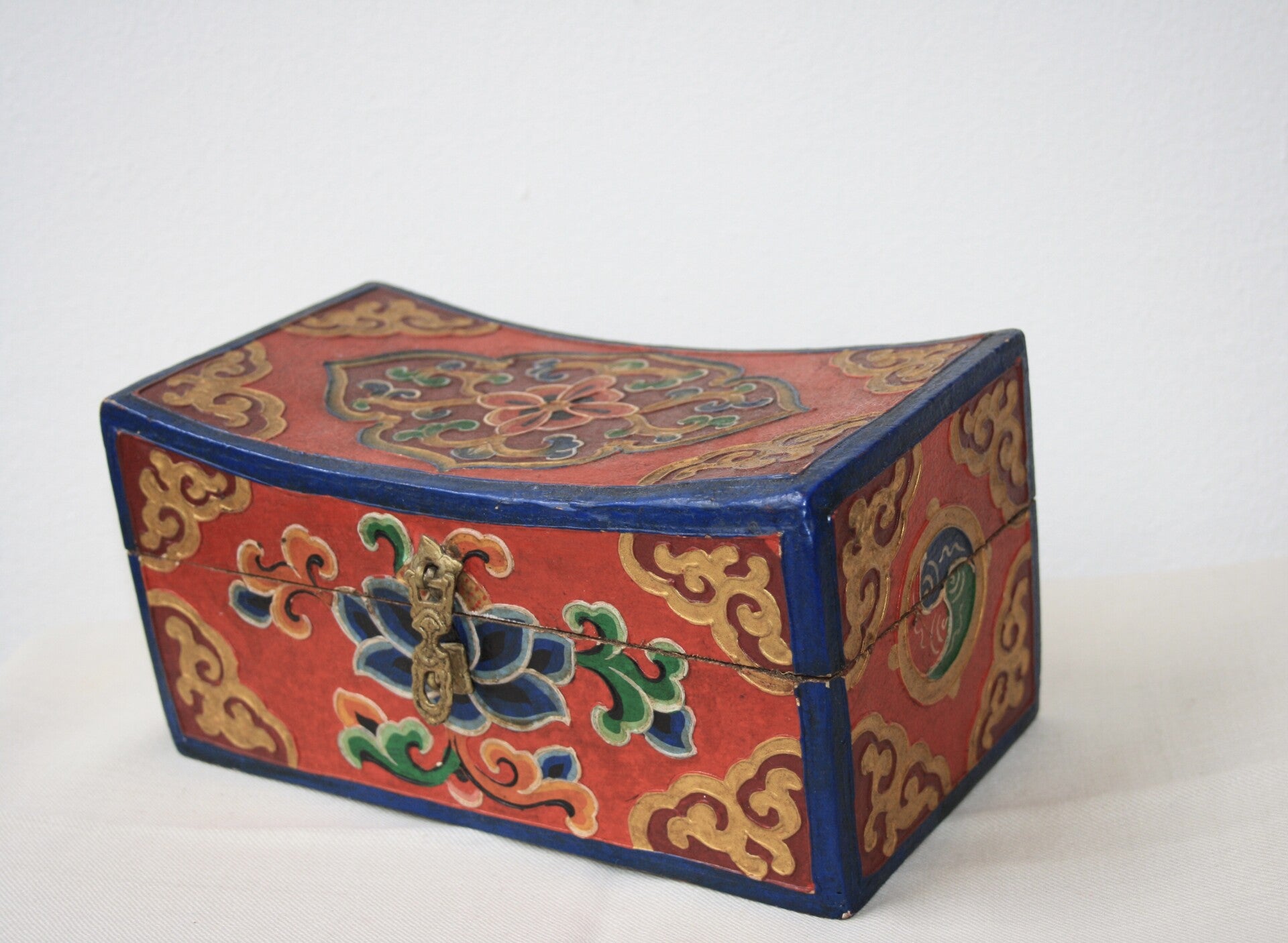 Met de hand beschilderde houten schatkist juwelendoos met lotusbloem symbolen en traditionele Tibetaanse ornamenten. Het is een geweldige manier om uw favoriete accessoires op te bergen.