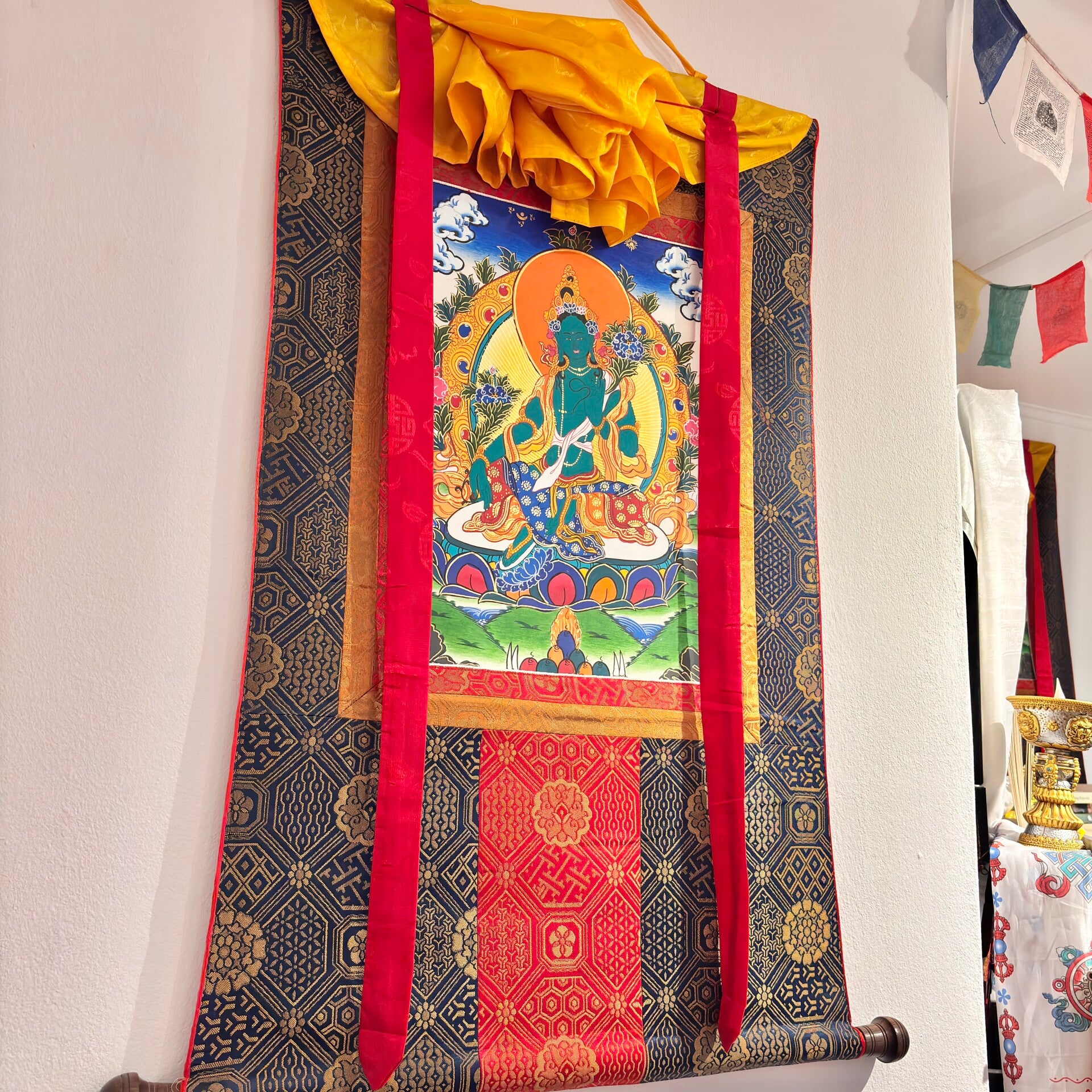 Een Tibetaanse thangka is een traditioneel, handgeschilderd boeddhistisch schilderij op katoen of zijde, vaak omlijst met rijk brokaat. Deze heilige kunstvorm wordt al eeuwenlang gebruikt binnen het Tibetaans boeddhisme als meditatie- en visualisatieobject.