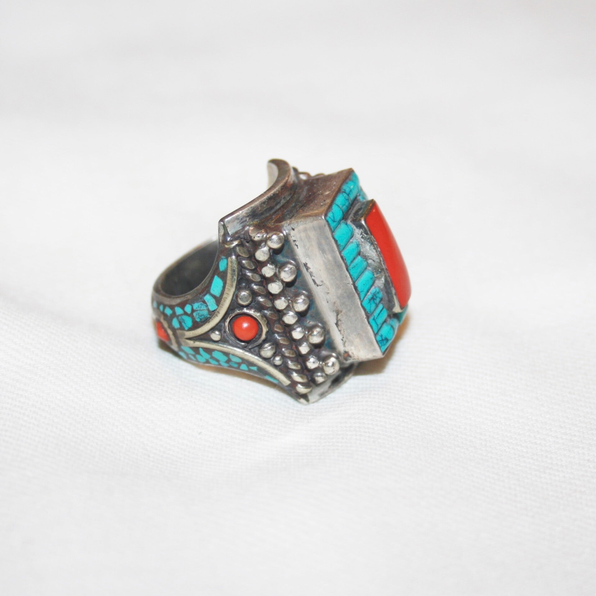 Deze prachtige handgemaakte ringen komen uit Nepal en Tibet en zijn gemaakt van wit metaal. De Tibetanen dragen graag grote sieraden met veel stenen. De stenen in deze ringen zijn samengesperst van de stofdeeltjes van Turkoois en koraal.