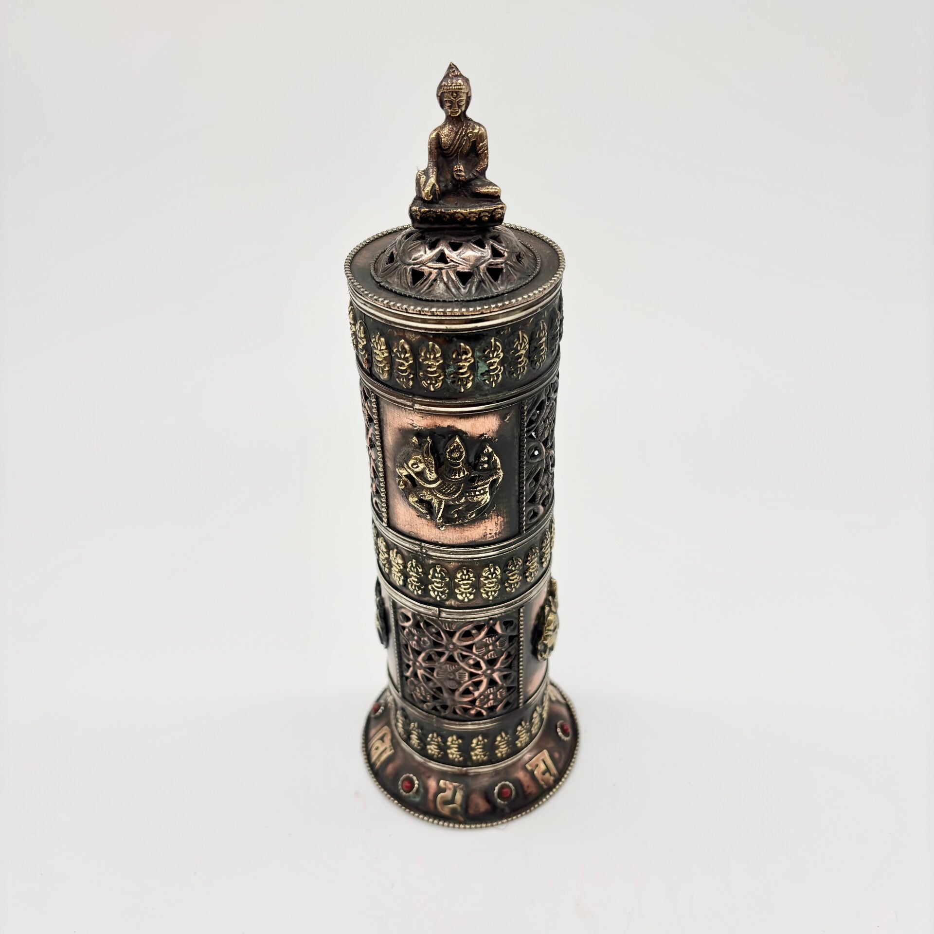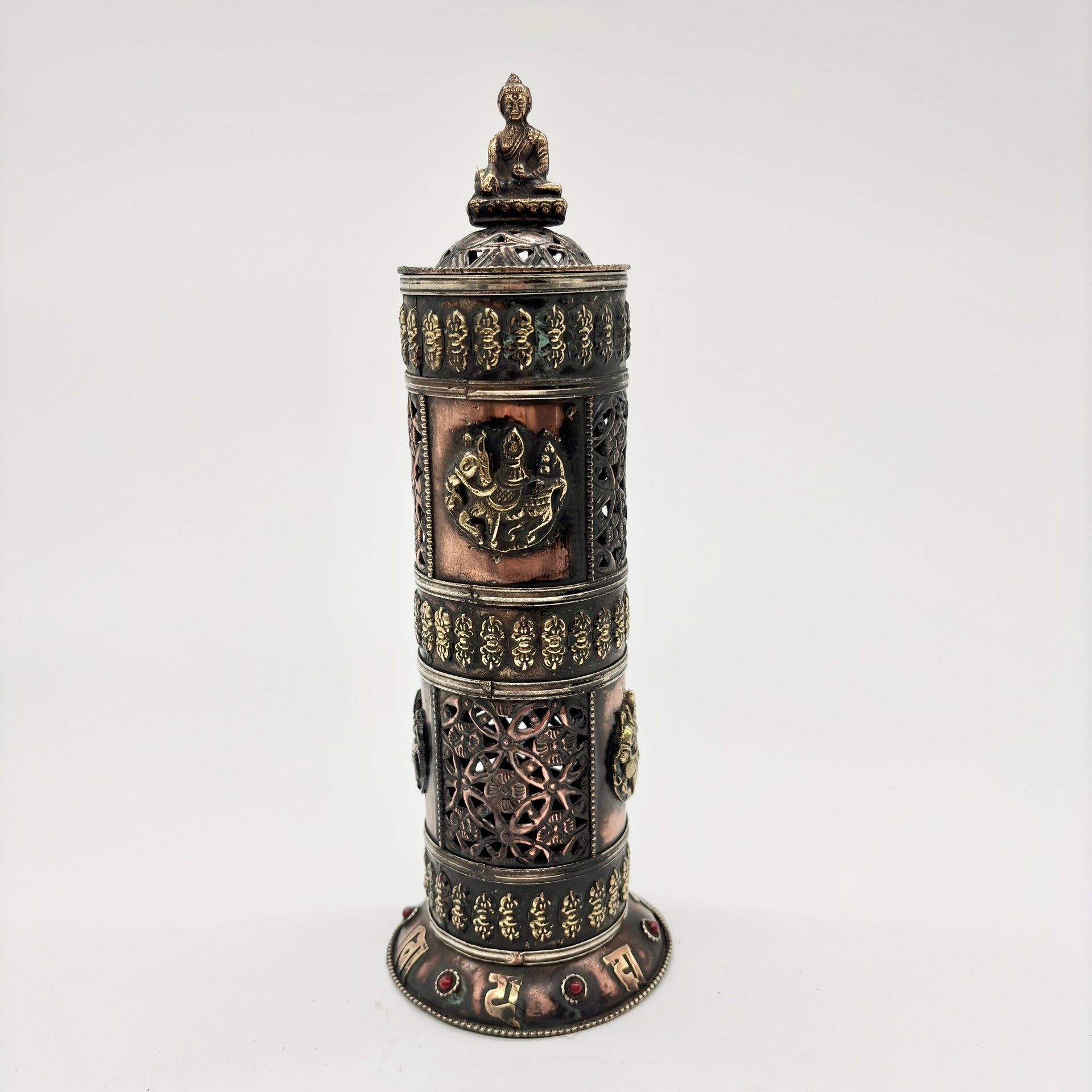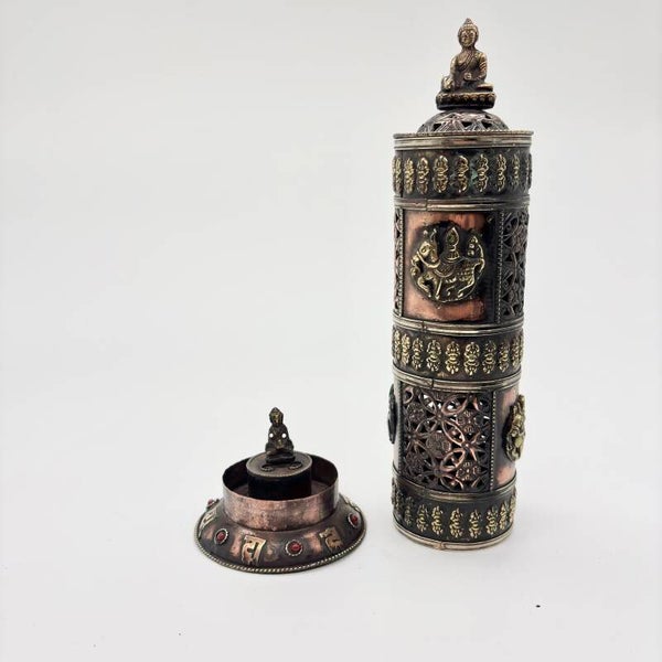 Deze wierookbrander is prachtig afgewerkt en rijkelijk versierd.De wierookbrander komt uit Tibet en is versierd met het Tibetaanse symbool lungta (windpaard).